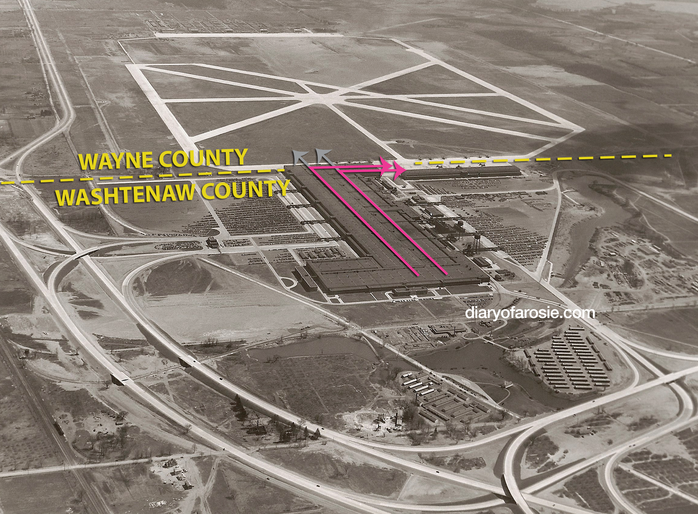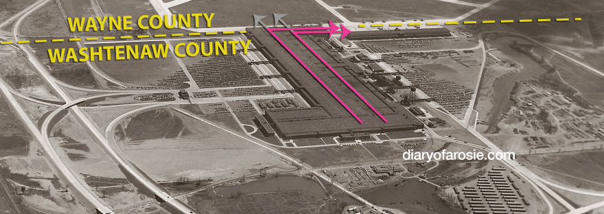 Well, Ford could not get either of the other two members of the Wayne County Board to vote with him in favor of the freeway extension. So in retaliation, when laying out the Willow Run Complex, he placed the revenue-generating factory on the Washtenaw side of the line, and the non-revenue-generating airport on the Wayne side. The assembly line was to run right up to the border, with the planes exiting the plant in Wayne county. But since they were built in Washtenaw, Washtenaw would get the tax revenue. This layout was really quite an “FU” to Wayne County.